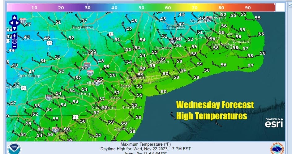 Weather conditions will continue to improve with lows by morning in the mid 30s to lower 40s as skies at least partially clear. It will be a bit breezy tonight into Thursday morning especially along the coast and some gusts over 30 mph are possible. Thanksgiving day itself will be a mix of sun and clouds and it will be a bit breezy. Highs will be in a range of 50 to 55 degrees.