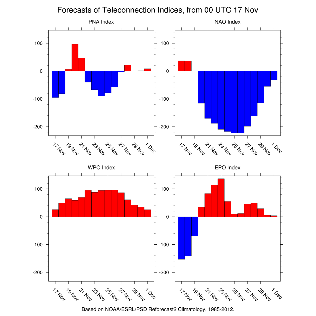 Now that we can pretty much say that the pattern change process is happening, we can begin to see the large impact the negative North American Oscillation is going to have over the next several weeks. To review the North Atlantic Oscillation measures changes in pressures in the north Atlantic. When the pressures in the North Atlantic are low (positive NAO), cold air tends to stay in the northern latitudes. When pressures are high (negative NAO) cold air is displaced southward usually impacting the Eastern United States the strongest. We are seeing the NAO crashing negative over the weekend and all of next week. This shifts the main jet stream much further south and much further south than we have seen in a very long time. The NAO has been virtually absent over the last 4 winters but it appears to be making a comeback for the start of this Winter season.