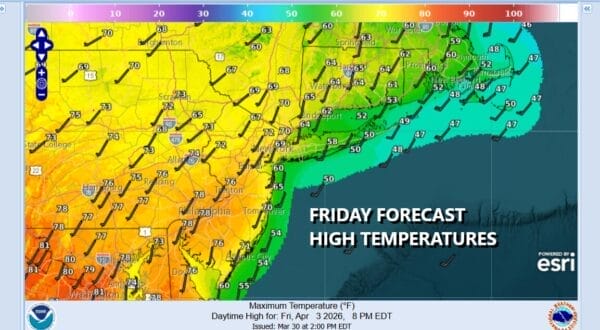 The Curse of the Onshore Flow has descended upon the Northeast and Northern Mid Atlantic states but it will be somewhat short lived. Easterly winds will bring in moisture, chilly air, and keep the area in lots of clouds all day long. Overnight rain is now in New England and moving east but you can expect some leftover patchy rain or just drizzle today. It also will be some 30 degrees colder than yesterday’s record highs around 80 degrees and highs today in many areas across Eastern Pennsylvania to Southern New England will not be getting out of the 40s. In fact some areas will be sitting in the lower 40s all day long.