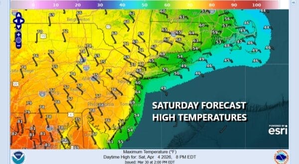 There will be wide spread in high temperatures ranging from the 50s along the coast of Long Island and New Jersey as well as south coastal New England but inland highs should reach the mid to upper 70s depending on how much sunshine develops. Saturday will be even warmer inland with highs reaching 80-ish in some places away from the ocean but the closer you are to the ocean flow, the lower temperatures will be. It should be no worse than partly sunny.