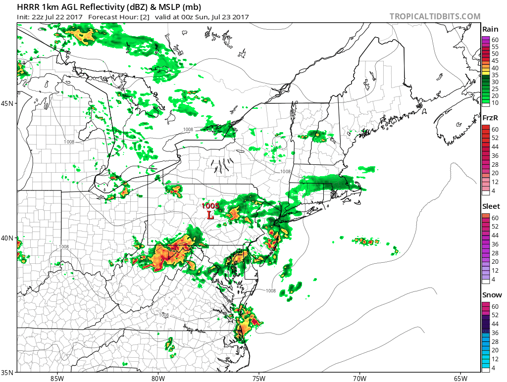 Across the Hudson Valley and Connecticut we are seeing rain with a few heavier downpours moving through but no thunderstorms are evident on the radar in these regions at the moment. We think thunderstorm development here will be minimal tonight.