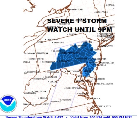 We have a severe thunderstorm watch up for parts our region covering the western counties of New Jersey that border the Pennsylvania state line from Warren County southward. The watch extends westward cover most of Eastern Pennsylvania south of Route 80 to the Maryland state line. It also includes Delaware. There is no watch up for the Hudson Valley in NY but we are seeing some severe thunderstorms on the radar there. No watches are up for Southern New England, the rest of New Jersey, and Long Island.