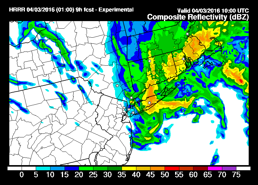 The HRRR model simulated radar for 5am shows the comma head over Long Island and Connecticut. It will be moving rapidly eastward which will limit any snowfall from this. The HRRR model as well as the RAP model are showing some areas getting 1 to 2 inches of total snowfall