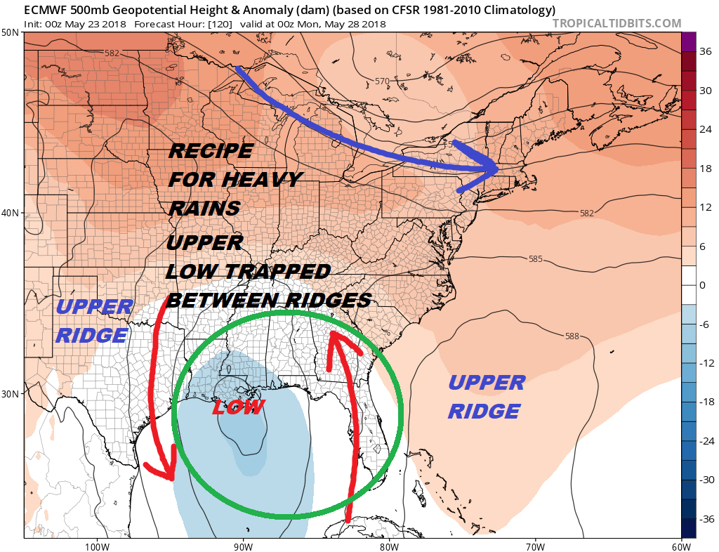 We may have a similar situation that occured last year with Hurricane Harvey only this time it will be further to the east across the Central & Eastern Gulf Coast. An upper trough gets trapped in between two upper highs, one on either side. There is nothing here to kick it our or move it along. The result could be days and days of rain on the order of at least 5 to 10 inches worth and likely more if this materializes. Most models seem to have the general idea here. Again rain is going to be the big deal here across the South. The northern jet stream keeps the moisture from moving up our way with a westerly flow aloft. However that will have its own weather systems that will be impacting our weather here so it won’t exactly be picture perfect. The National Hurricane Center has raised the probability of tropical cyclone development to 60 percent.
