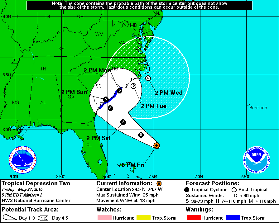Latest observations from an Air Force aircraft indicate that the disturbed weather off the southeast coast has become better organized and Tropical Depression 2 has formed. Tropical Storm Warnings are posted for all of coastal South Carolina.