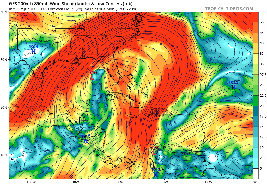 The area in orange is showing strong winds of 40 knots or higher on the west side of the surface low. The area in blue shows winds of 20 kts or less. The surface low sits under the low wind shear but there is strong wind shear on either side, assuming the model is correct on this. This system may wind up behaving more like a subtropical system then a truly tropical system. However this is something that we won’t know until the system gets going over the weekend. The outcome could be heavy rains on the east side of the low which is forecast to move toward and over Florida later next Tuesday.