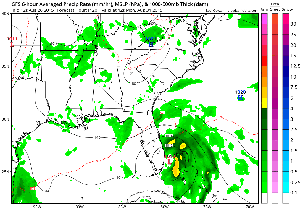 This afternoon we are going to take a look at what the global models are telling us with regards to Tropical Storm Erika to see what they have and where the tropical storm winds up by 8am Monday morning August 31. Starting off with the Canadian model which is most aggressive with development and it shows what would be a category 1 hurricane or strong tropical storm sitting off the central Florida coast. Surface highs are draped around it. We of course are just continuing a rain free warm pattern here which is an extension of what we will have this weekend