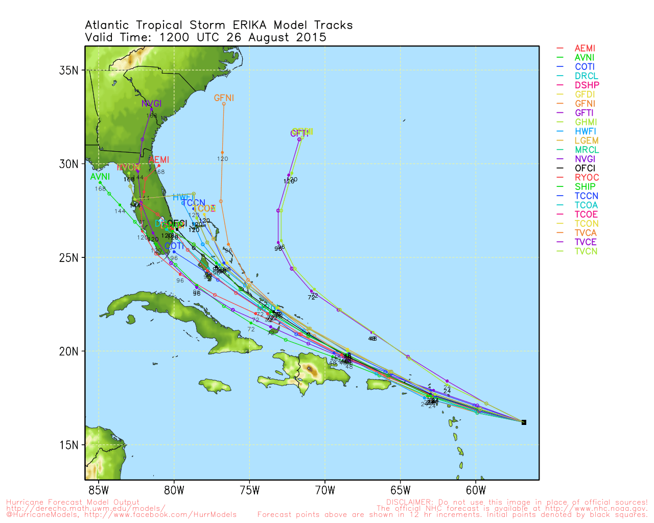 The GFS has a much weaker system further south, either a minimal tropical storm or a depression approaching south Florida. In terms of determining intensity this is of course the toughest part of the forecast. We have been indicating for days that the semi-hostile environment Erika is in now is going to be a determining factor as to what we will be dealing with down the road. Strong shearing exists between where it is now to at least 65 west and possibly even to 70 west. If that shear enviornment is still there when the storm moves through, at the very least it would prevent if from strengthening.