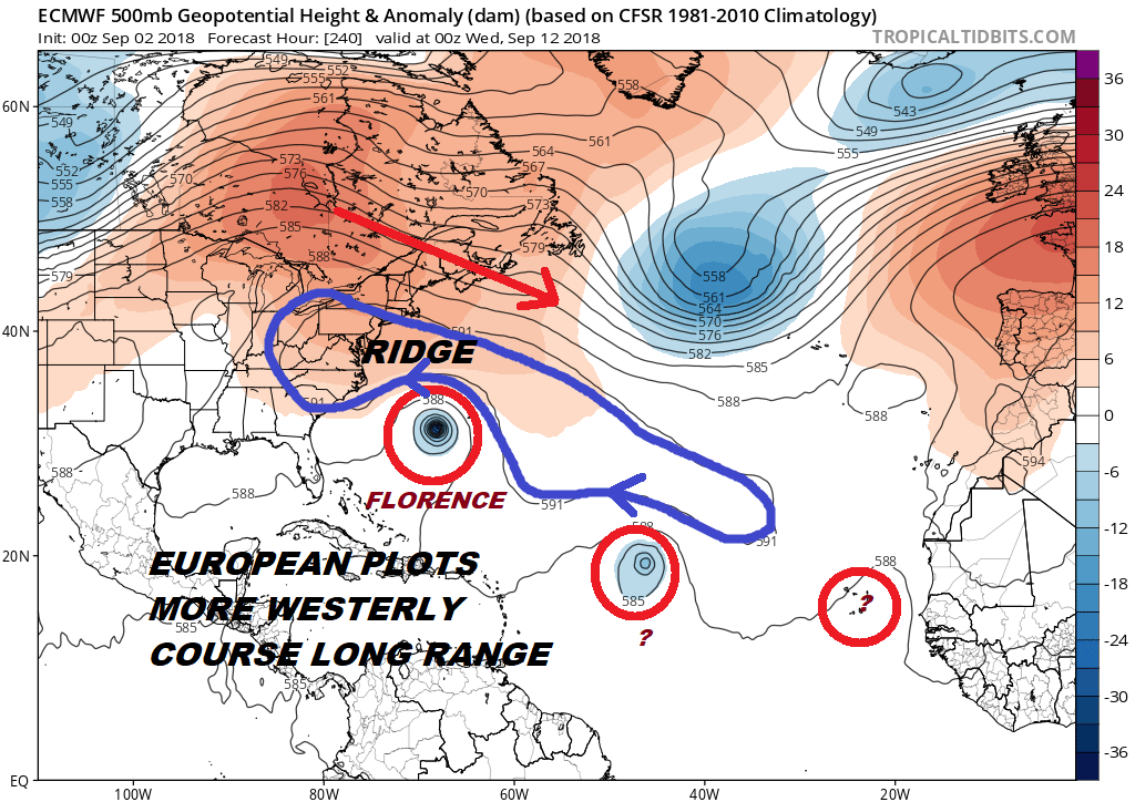 Florence will have two opportunities to respond to upper level winds that could turn it to the north. The problem with this scenario is that the system will remain relatively weak..that is it is unlikely to strengthen to a hurricane anytime soon. If Florence remains a tropical storm it will more than likely respond to the lower level steering winds which means a more westerly course in the longer term. The European model has been very consistent on this view and carries Florence west or west north west through much of its 10 day forecast period. The GFS turns Florence northward due to it developing Florence into a major hurricane (which is likely to be overdeveloped).