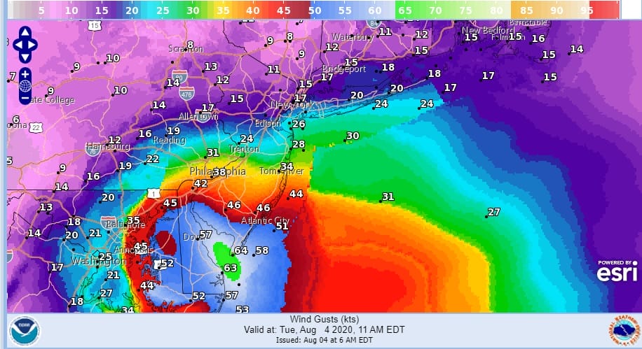 As far as winds are concerned the strongest winds will be east of the track of Isaias and we will see winds gusting to 50 to 60 mph easily and some gusts to 70 mph or more are not impossible. This all happens fast so look for winds to pick up rather quickly and they will also drop off rather quickly after about 6 hours of rough wind. Here are views of the forecast winds gusts at 11am and 2pm but bear in mind these winds could come in faster as well as exit faster.
