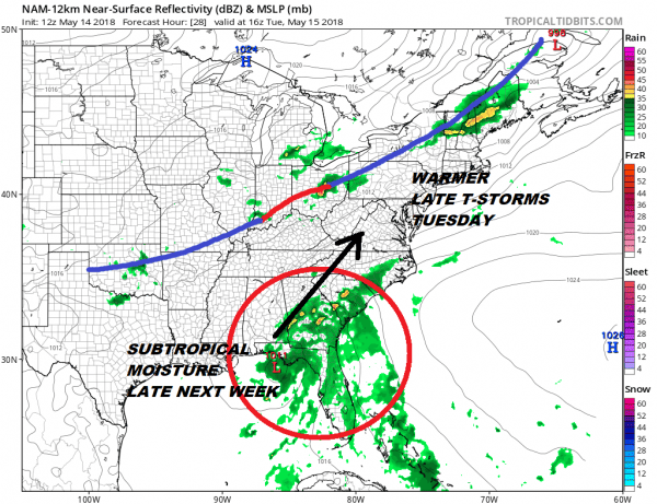 Regardless of development the moisture from this system will start spreading northward into the Southeast US and eventually that moisture will likely make its way here later this week. Tropical or Subtropical storms in the Atlantic Basin are unusual in May but certainly not unheard of. In fact we have see a tropical storm in May form last year. The Gulf of Mexico is one of the few places where the water temperatures are supportive for such development if upper air conditions are favorable. Right now the National Hurricane Center is in watch and see model. Weather models are picking up on this as the NAM shows today.