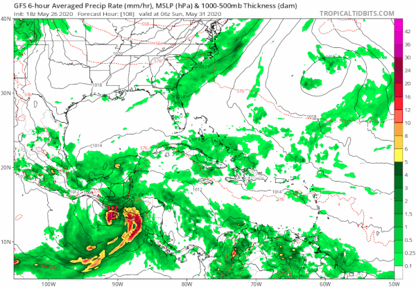 The GFS model has been insisting on something coming from this as the Pacific tropical system moves northward and inland and a large gyre turns over the region over Central America into next week. This creates an environment favorable for disturbed weather to develop across the Western Caribbean into the Bay of Campeche.