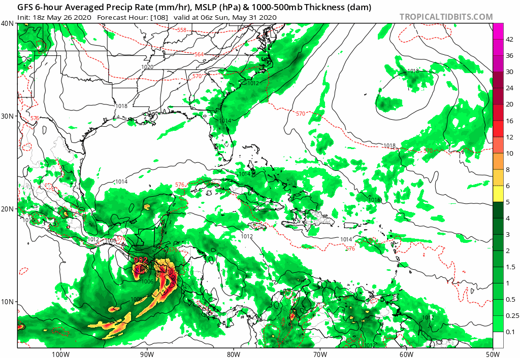 Watching the loop of the GFS which carries into the middle of next week shows this spiraling mass of moisture with falling pressures in the Northwest Caribbean. If something forms this time of year, this is the area where you would might see something for late May and early June. It is something to watch for the time being. One thing that strikes me is the early activity may be a signal of an active hurricane season ahead.