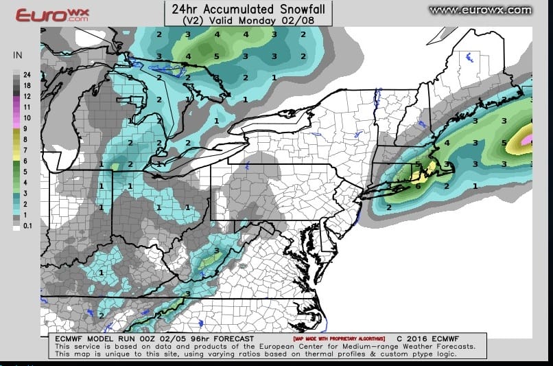 I got up early this morning because I wanted to at least get to see some of the snow outside which is coming down nicely here. Then I said to myself let’s look at the next one. I just new deep down inside that it was going to bring that first storm back westward. Lo and behold that is exactly what we have as the European is back to the two storm solution. In fact the first low is so far left on the European that if you adjust for all the errors of recent storms swinging left at the last minute, Monday into Wednesday is going to be just fascinating! This is Monday’s daytime snowfall forecast from the European from the first storm (I’m not counting today). This is getting too confusing!