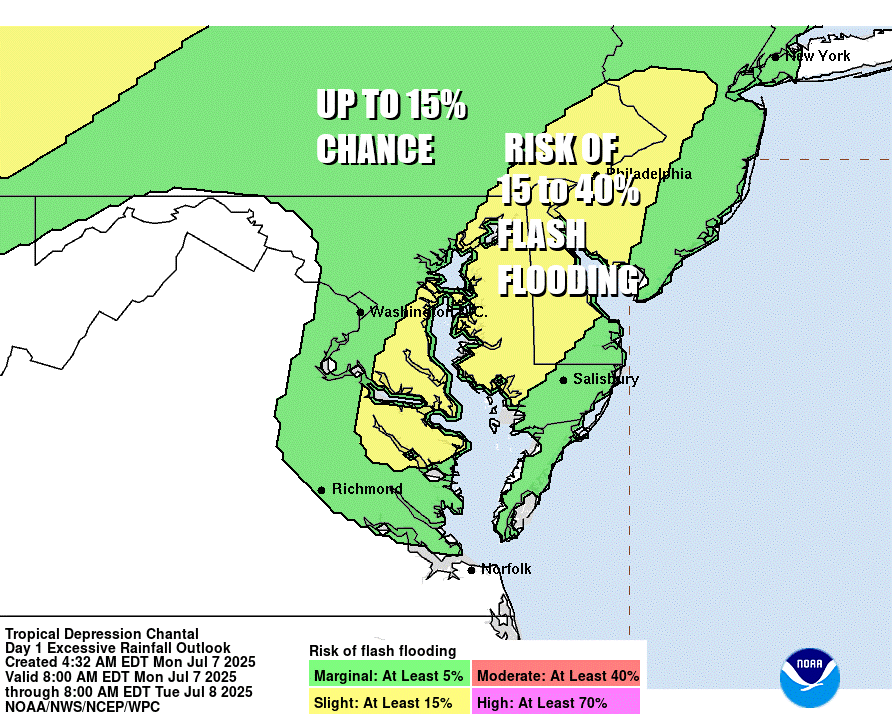 We have the combination of very warm to hot unstable air that is saturated with moisture. Dew points will be in the 70s today so the atmosphere is basically a soaked sponge. Add to this an approaching weather front well to the west and north, and tropical moisture leftover over from Tropical Storm Chantal, and you have the set up for very heavy thunderstorms that can produce heavy rain and flash flooding. The Weather Prediction Center is indicating such risk from Northeast Virginia northward to New York State including much of New Jersey, Eastern Pennsylvania and the Hudson Valley.