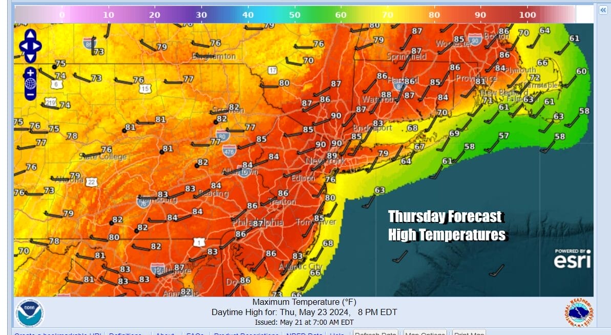 When a strong storm system tracks up into the Western Great Lakes it usually means warm weather in the Eastern US and we have certainly set ourselves up for this today. Yesterday we saw plenty of sunshine and temperatures that reached into the 80s away from the ocean. Today we have more of a southwest wind which lessens the impact of the cool ocean and most highs will be in the mid to upper 80s inland. This comes with plenty of sunshine for much of the day. Some warm spots could approach 90 degrees this afternoon.