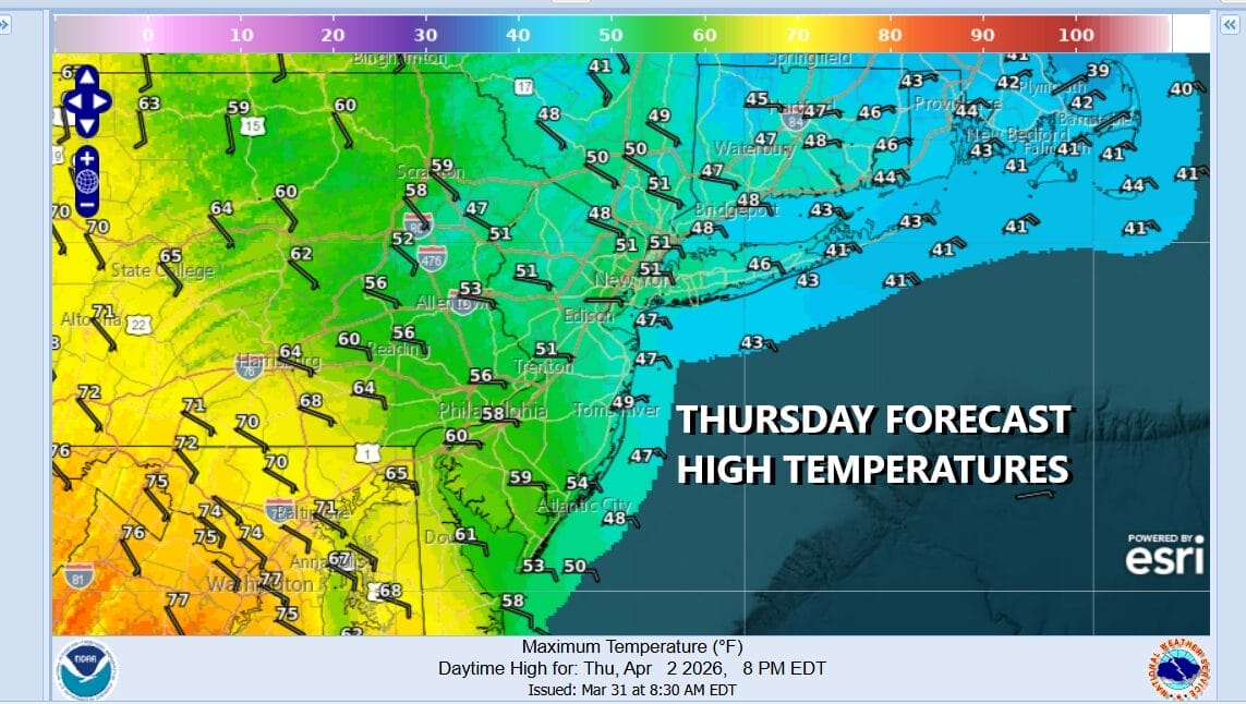 There will be some shower activity overnight lasting until about daybreak in some areas but there will also be a wind shift to the northeast and east and that brings the “Curse of the Onshore Flow” into play for Thursday. It is going to be a raw day with overcast skies and the risk for some patchy light rain or drizzle. In other words, a miserable spring day with highs just in the 40s except lower 50 from South Jersey southward.