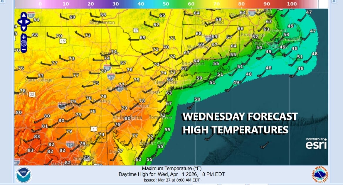 When you start the day with temperatures in the 60s on April 1st, you know it is going to be a very warm day. We are going to have cloud issues today along with some scattered showers this morning into this afternoon so this might impact temperatures. We still however expect temperatures to reach the middle to upper 70s away from the ocean from New York City south and upper 60s to lower 70s from New York City north.