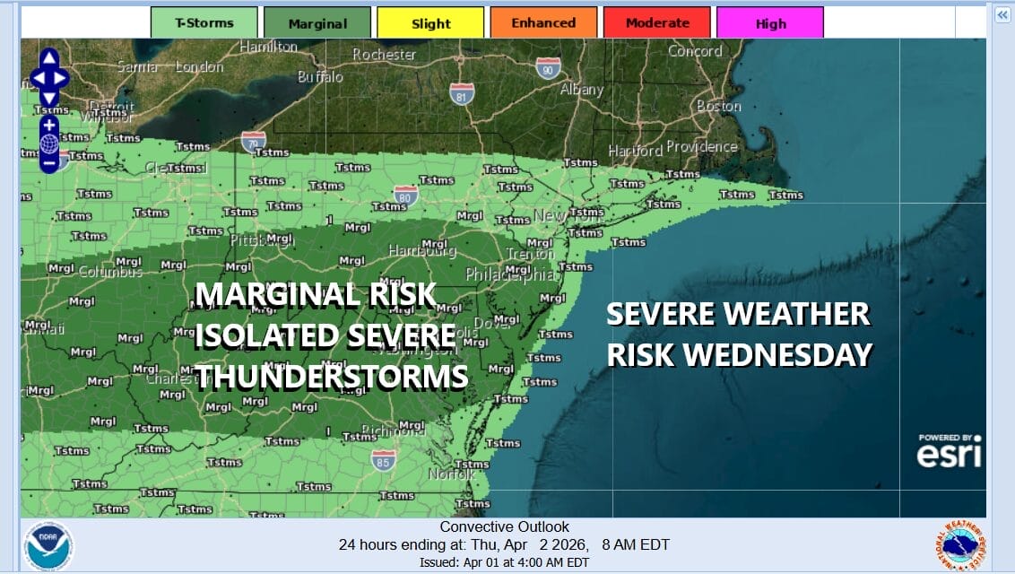An active cold front is approaching as evident on the satellite and radar loops. Showers and some thunderstorms will likely be in play later this afternoon and evening as the front struggles to move from north to south. This opens the door to the possibility of severe weather risk and the Storm Prediction Center is indicating a marginal risk for isolated severe thunderstorms mainly for Southern New Jersey, Southern Pennsylvania and points southward into Maryland Delaware and Virginia. General thunderstorm activity is flanked around the risk zone and that reaches north into the Hudson Valley and Southern New England.