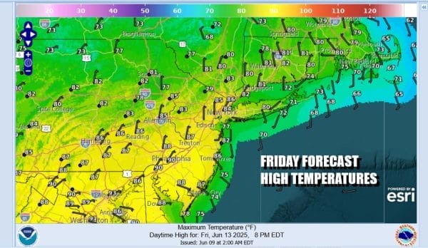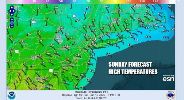 Not much changes for Sunday with showery rains or drizzle from time to time, otherwise it will be cloudy and on the muggy side. Father’s Day highs will be again in the 60s to near 70 east of New York City while to the south from Central and South Jersey south into Southeastern Pennsylvania and points southward, highs will probably reach the low and middle 70s.