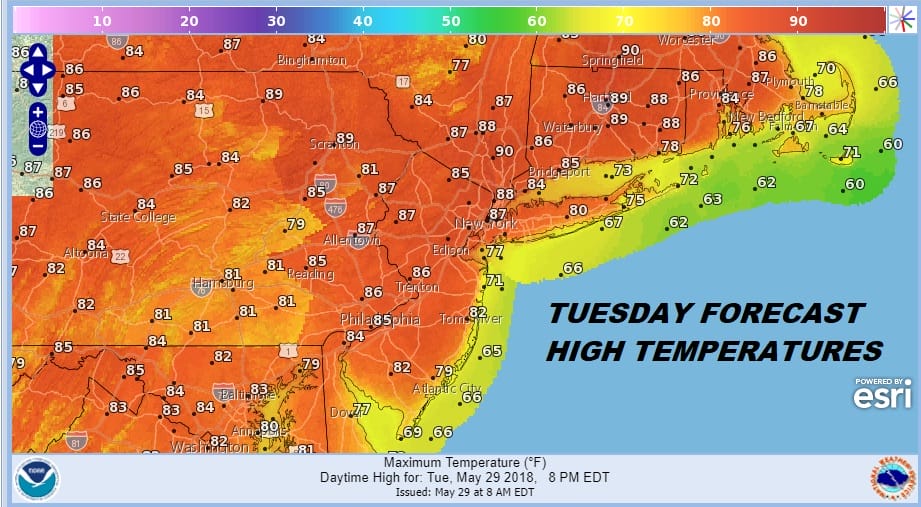 Today is the one and only very warm and humid day because high pressure builds down from Canada off the New England coast which turns the winds onshore for Wednesday. We will be 10 to 15 degrees cooler Wednesday with clouds and some sunshine. Highs will be just in the upper 60s to middle 70s.