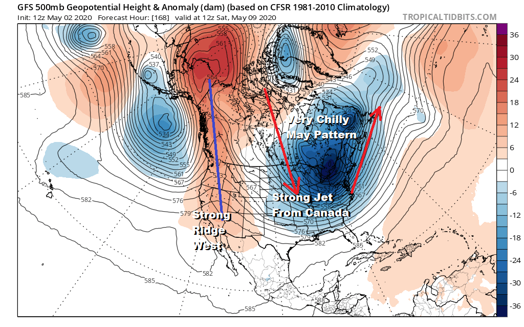 The strong flow from Canada is solid with a straight pipeline from the Canadian Northwest. We will probably deal with showers late Friday into early Saturday with wind cold weather to follow for later Saturday and next Sunday. We could see high temperatures both Saturday and Sunday Mother’s Day not out of the 50s and we will have to see whether late season freezes are possible next Saturday night. Wait before planting tomatoes!