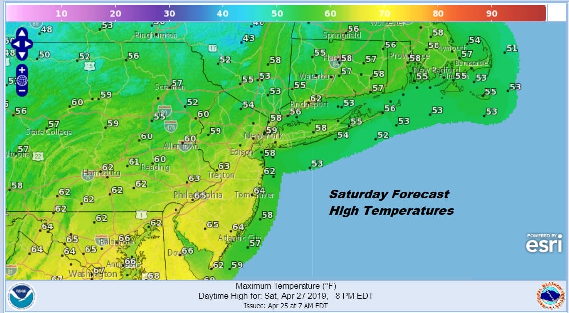 Late this afternoon into the evening a spot shower can’t be ruled out but we will see more numerous showers in the hours before and shortly after daybreak Friday. There could be some heavier downpours and perhaps even a thunderstorm as the warm front goes by. Once the warm front goes by we wait for the cold front that comes late in the day with more downpours and possible thunderstorms into Friday night. The Storm Prediction Center has placed Southern New Jersey and Southeastern Pennsylvania at a marginal risk for severe weather with the risk for general thunderstorms further north into the Hudson Valley and Southern New England. Temperatures on Friday will be in the 60s in most areas but Southern New Jersey south of Route 195 could see highs in the mid 70s to near 80.