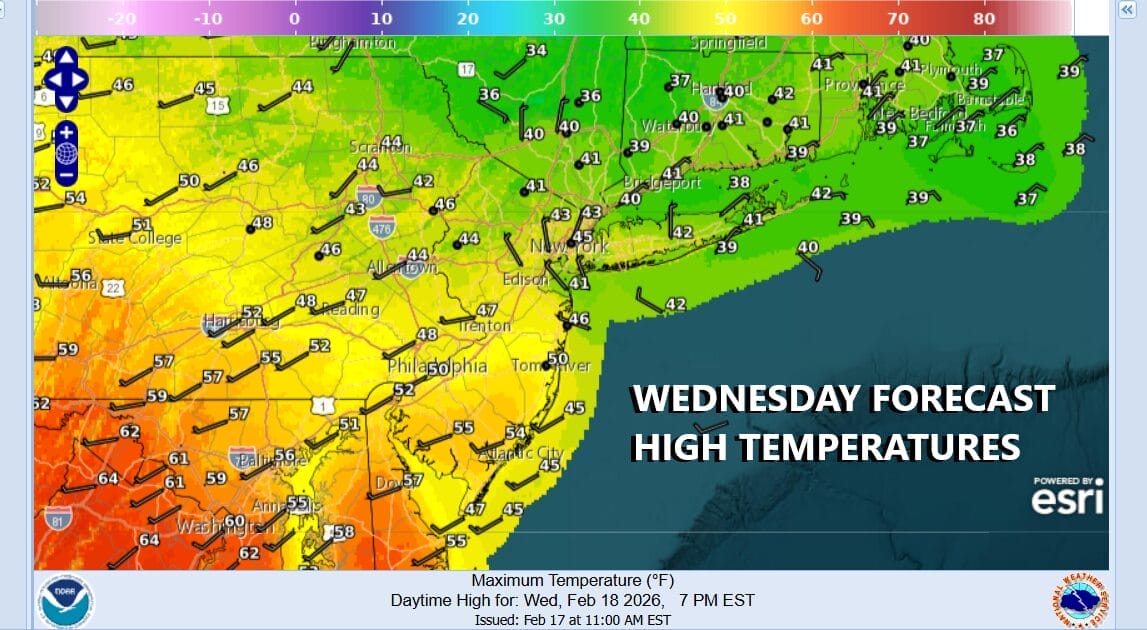 We are in the soup today across much of Eastern Pennsylvania to Southern New England. Dense fog advisories are in effect. Fog is the great snow eater and at least we are going to see some of the snow cover get eaten away by the fog even though temperatures aren’t all that high. Today is going to be a day where we are going to see a wide range in temperatures which is often the case in a warmer spring like pattern that we are in at the moment. Fog will try and lift but it will be stubborn in some areas. Also there will be some rain in the mix later today along this warm frontal boundary. High temperatures will be in a wide range. From New York City north and east, highs will likely struggle in the upper 30s and lower 40s, but in areas from Southern New Jersey, Southern Pennsylvania and points south, where winds will turn more southwest, we could see some breaks of sun later today and highs in the 50s.