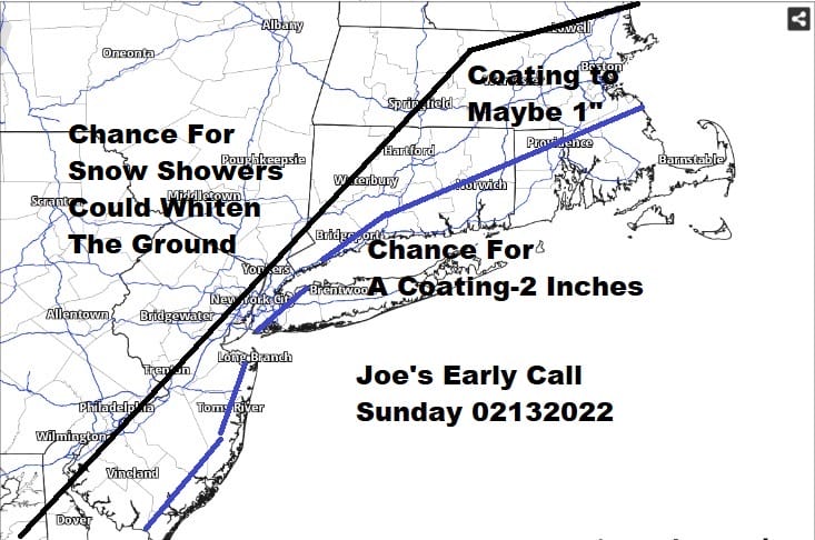 I didn’t notice any important changes in weather models overnight. Some are a little more robust than others. All have relatively similar ideas it is a matter of how much precipitation they generate and their own views of what the radar looks like. I’s staying with my original idea of a coating to a few inches coast and east from New Jersey east of the Garden State Parkway to Long Island, Southern Connecticut and Southeast New England with less to the north west.