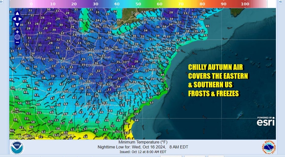 This low will strengthen in Eastern Canada Sunday night and Monday and it will help to draw southward very chilly air into the eastern half of the US and that includes areas in Deep South and the interior Southeast US. This will be a week where many areas will experience their first frosts and freezes of the season with the exception of larger urban areas as well as coastal areas.