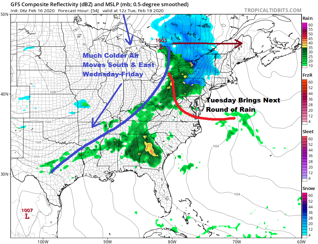 In spite of all the clouds there really isn’t much to worry about radar wise. We do have a weak cold front arriving tonight but there won’t be much with that. High pressure will build in behind it for Monday Presidents Day which clears out the cloud cover and brings us a good deal of sunshine for most of the day. Highs will be mostly in the low to mid 40s.
