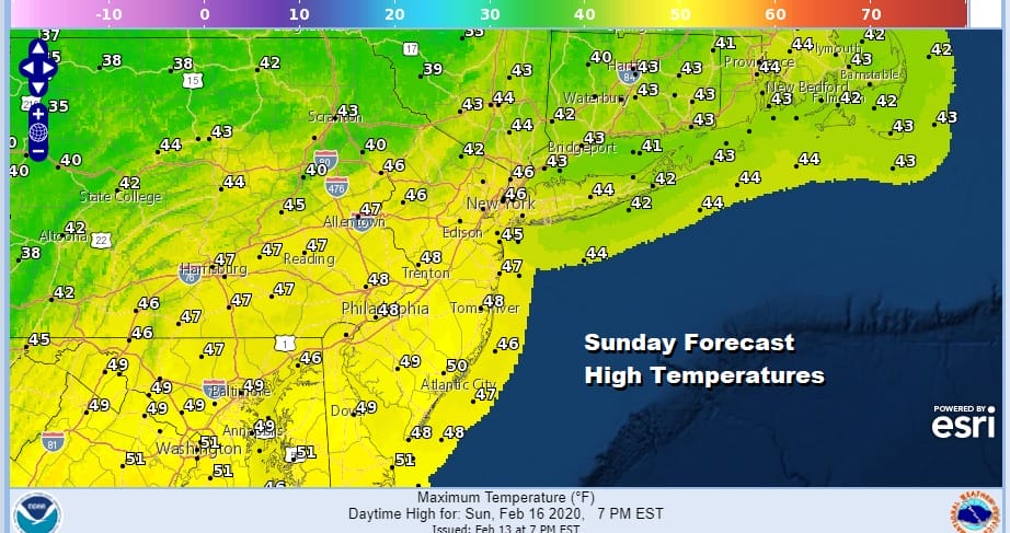 Day two of the holiday weekend is a warmer one now that the core of the arctic air has moved out almost as fast as it moved in. In fact it moved out so fast that clouds developed overnight and we will be dealing with high clouds today with breaks of limited sunshine. This should not stop the temperatures from rising up into and in some cases through the 40s. Areas to the south of NYC and Philadelphia might push the upper limits to the upper 40s to near 50 if we get enough sun in the mix.