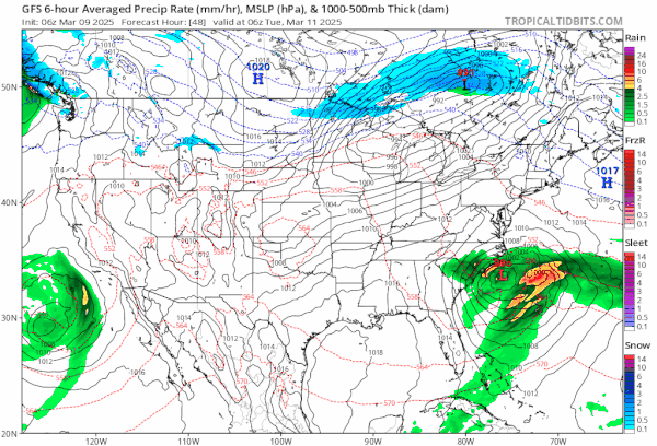 The week ahead for the Northeast and Mid Atlantic states is about as storm free as you can get. We have a system moving across the Gulf States today but that low is going straight east out into the open waters of the Atlantic. The week ahead is about higher pressure giving way to higher pressure and split in two thanks to a backdoor cold front. That front will pass through late Tuesday and stall somewhere across Southern Pennsylvania & Southern New Jersey.