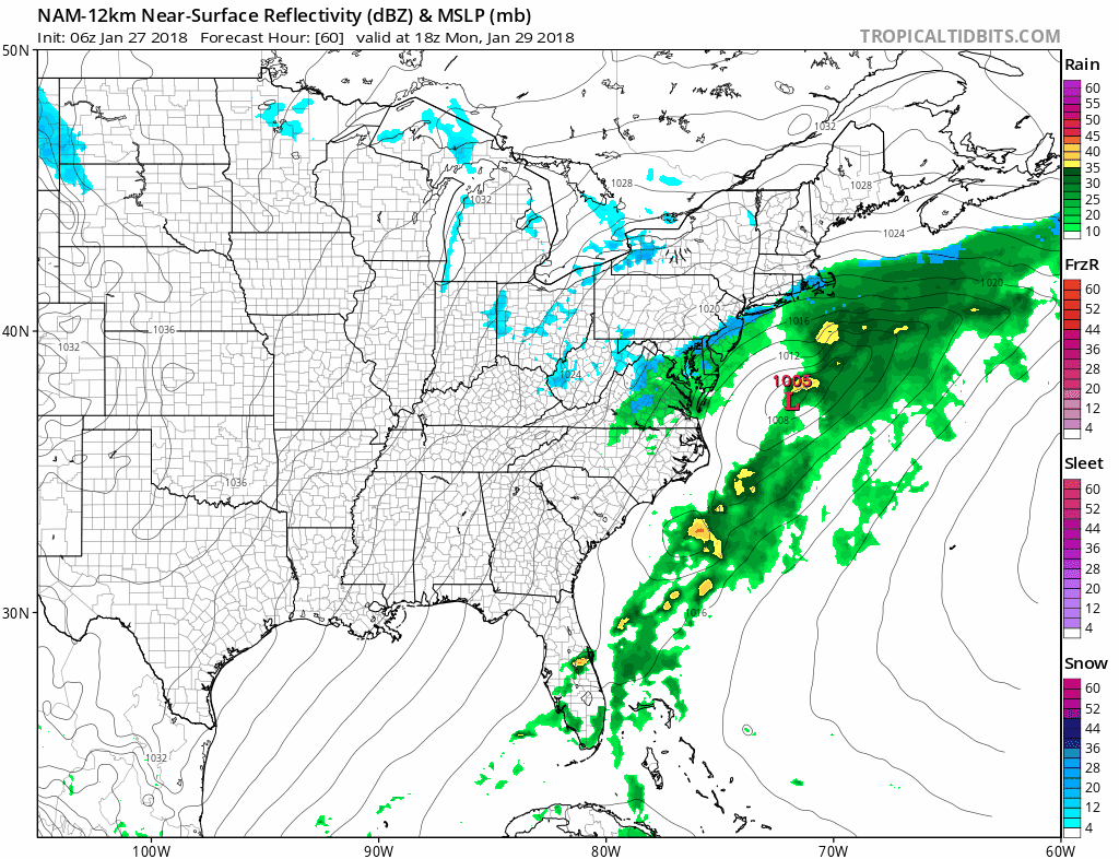 Last night’s NAM model which had snow for Monday afternoon into Tuesday..then didn’t have it..now has it again. The problem with forecasting with disjointed pieces in the upper atmosphere as well as the surface is that you don’t know which if any of the pieces wind up coming together and if they do there could be other things like whether temperatures cool enough and how fast. For now we will leave the idea of some snow later Monday into Tuesday morning with the potential for a coating to an inch or so and wait until we see some clarity on all this.