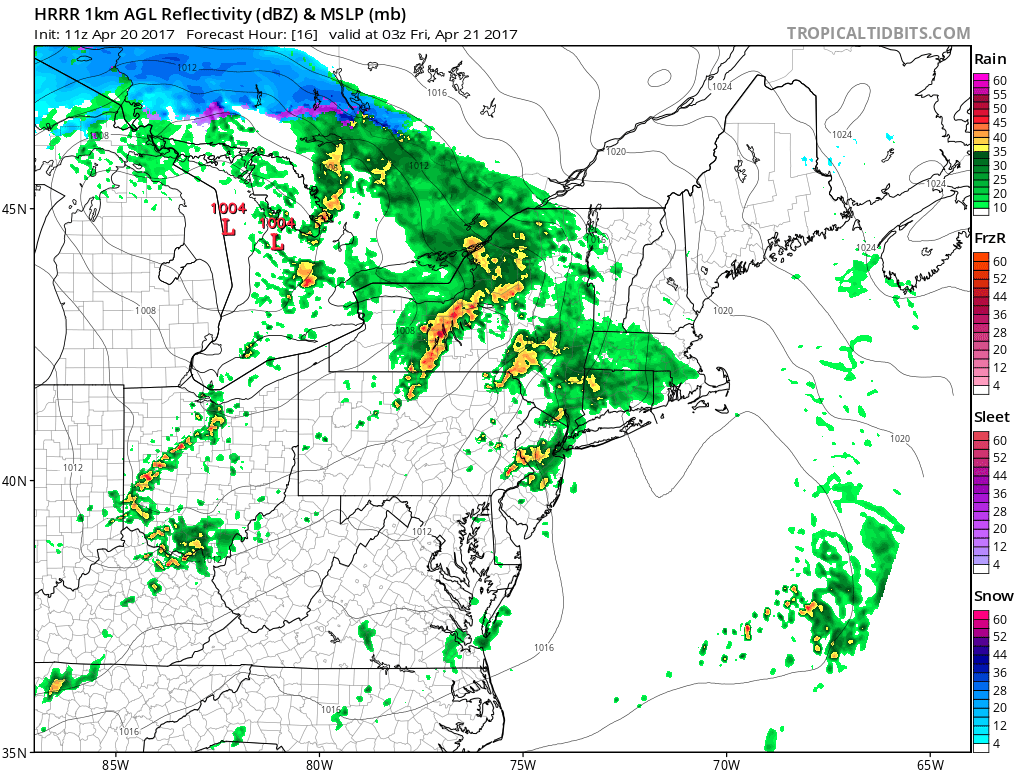 The HRRR model at the moment shows some showers and possibly an thunderstorm rolling through around 9-11pm tonight. A stronger line is northwest of it.