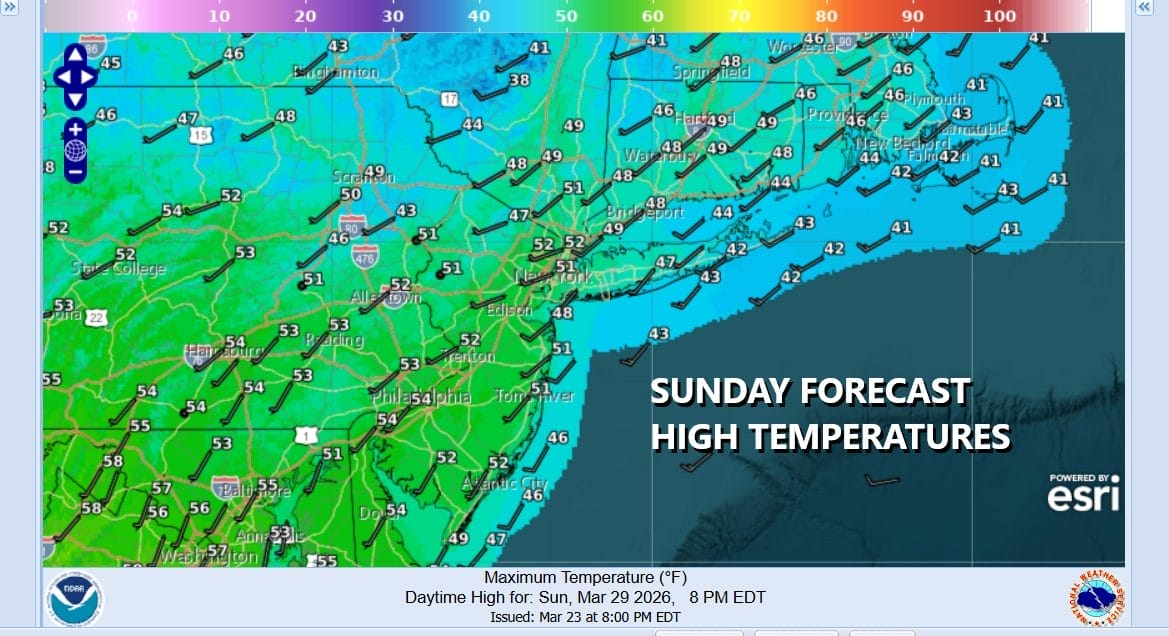 Even though the core of the cold air mass is now offshore and winds have gone southwest, temperatures are just bouncing a little higher today. It didn’t help matter to have lows well down in the 20s in some places this morning. At least we continue to see mostly cloud free conditions this afternoon and we will finish the day with highs generally in the upper 40s and lower 50s. Temperatures at coastal locations will likely be about 10 degrees lower with the wind off the cold ocean. The good news for tonight is that it won’t be as cold with nothing more than a few clouds around. Most lows Monday morning will