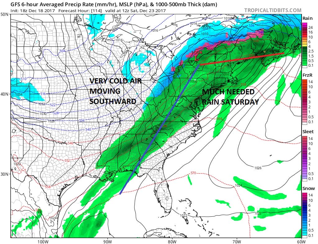 Weather models have been going back and forth on which way the push of cold air will be. Today’s weather models clearly point to a southward push rather than east but the atmosphere remains in a very volatile state and a shift to the east in the extent of cold air is not impossible. The GFS model is the coldest model of all the major models and even this model argues against snow as the push of cold air remains mainly to our west.