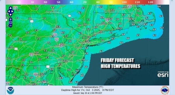 Another cool morning start is going to lead to a nice warm up over the weekend. Skies up and down the East Coast and west to the Rockies are mainly clear. High pressure is holding on in the East and will eventually settle over the Middle Atlantic states for the weekend. This leaves us with no issues. Sunshine today from start to finish and high temperatures should reach the upper 60s to lower 70s. Temperatures tonight won’t be as cool as past nights with most lows in the 40s inland, 50s coast, and upper 50s to near 60 in warmer urban locations.