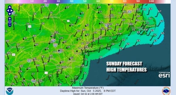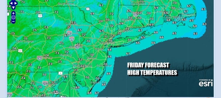 Sunday will also be a partly to mostly sunny day. Some low clouds and patchy fog could start the day off in some places but that will quickly burn off. Once again we will see temperatures reaching the upper 70s to lower 80s across Eastern Pennsylvania to Southern New England. A cooler ocean means south and east facing shorelines of New Jersey, Long Island and Connecticut will be about 5 to 10 degrees lower.