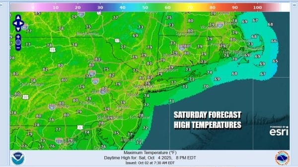 Let’s move on the weekend where not much is going to change. High pressure will be along the Middle Atlantic coast. Winds are going more southwest and that means temperatures will warm up rather fast. Skies Saturday will be partly to mostly sunny. High temperatures will reach the upper 70s to around 80 degrees though ocean winds will likely keep it cooler along south and east facing shorelines.