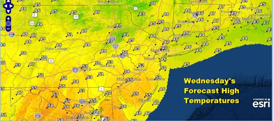 The further north you go from NYC temperatures will likely struggle in the low to mid 40s though there will be sunshine. On the other hand if you are south and west of Philadelphia you might see some upside here with temperatures reaching the mid and upper 50s. We do have a cold front that will pass Wednesday night with just some clouds and the outside chance of a passing shower.