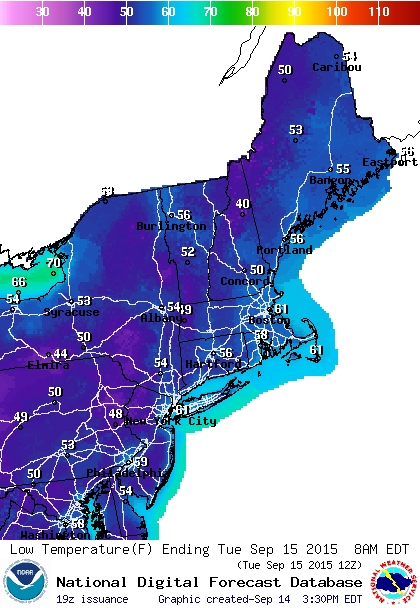 No issues, no complications with the weather forecast for at least the next 10 days! The biggest weather forecast question is how low do temperatures go tonight and it will be in the 40s in the coolest spots inland and away from urban areas while low 60s will be the bottom along most coastal locations. This morning’s low in New York City was 59 which was the first time in the 50s since back in June. Inland spots have already seen their first upper 40s in the last couple of weeks so for you folks this is no big deal. Tuesday we should be back up into the low 80s. Wednesday we will see middle 80s.
