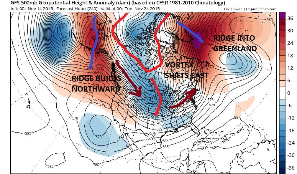 Now lets jump to Thanksgiving eve where the vortex actually drops pretty far south into Southeastern Canada. This would be a very strong shot of cold air for this time of year. Blocking highs are set up over Western Alaska keeping the Pacific jet stream pretty far south in a split flow there while a strong ridge in the Atlantic wraps around the vortex into far Northeastern Canada.