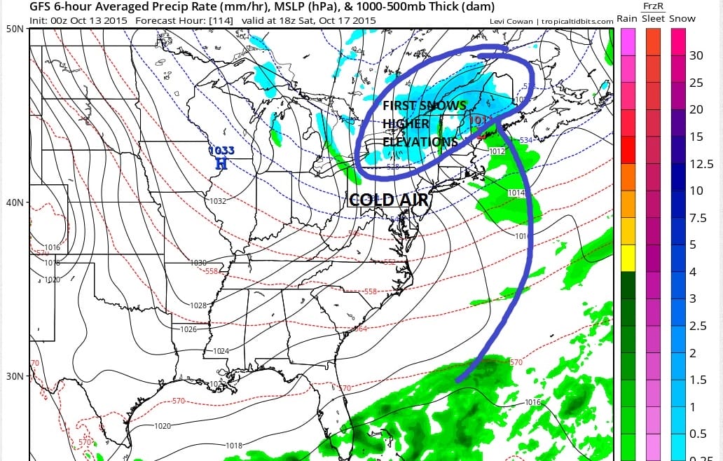 Friday’s cold front is similar to the one on Tuesday as it will also have limited moisture with it so we will allow for a few showers with that when it goes through. Again this should be no big deal, however it is behind that front that the cold air comes in for the weekend. A second disturbance in the cold air will produce the first snows for higher elevations in parts of upstate New York and then extending through Northern New England. I guess we can call it the first cheap thrill for those folks!