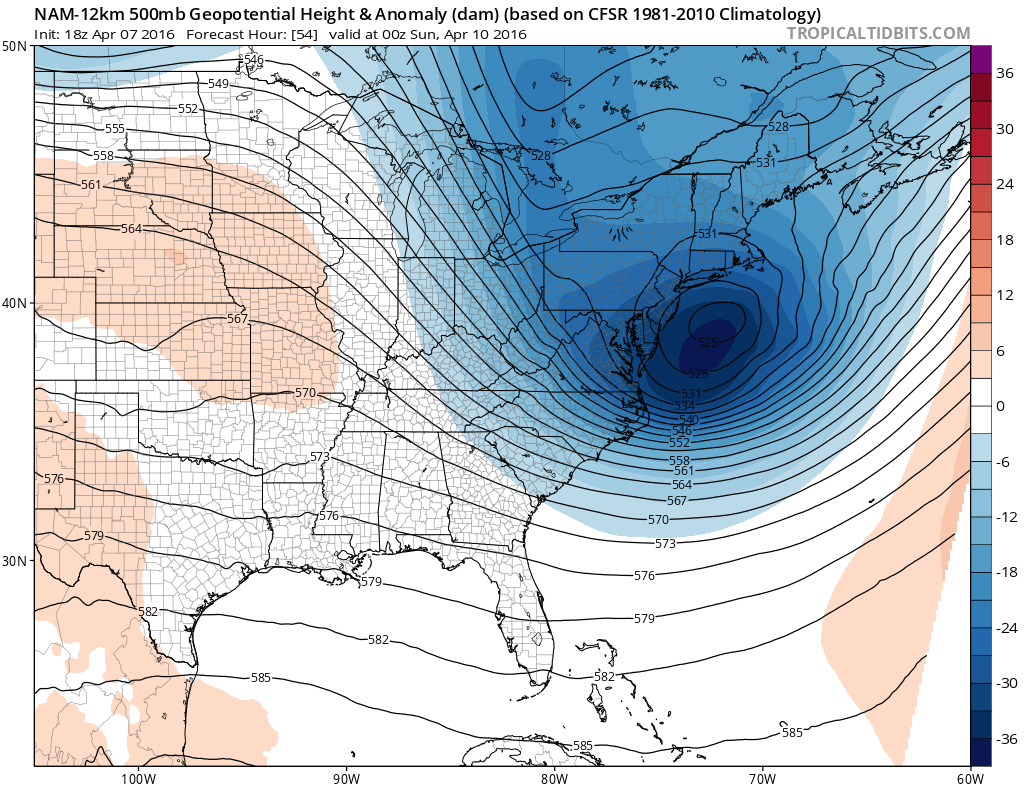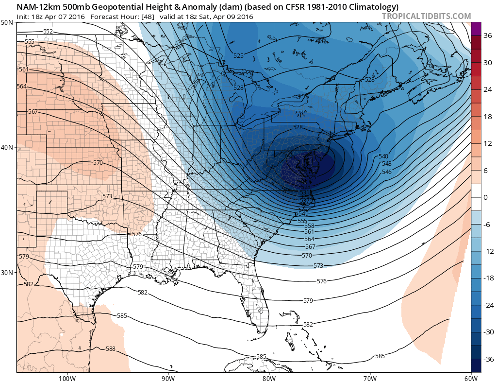 As stong as this upper air system is, there is so much going on in the upper flow to the north that it is preventing the surface low from strengthening much. The result continues to be a narrow and of precipitation and and even smaller band of heavy wet snow inside that band. The late afternoon NAM for example favors heavy wet snow for Southeastern and Eastern Pennsylvania and much less if any at all everywhere else. You can see how tight everything is on this surface map for late Saturday afternoon. Spring systems take on a more convective nature as we have discussed previously meaning that some spots especially in elevation could get a solid shot of wet snow, while other areas not that far away get much less. We should be able to resolve this Friday although I have a feeling we may have to wait to actually see the signature on the radar Saturday to determine how this finally plays out. Confidence in the forecast remains low.