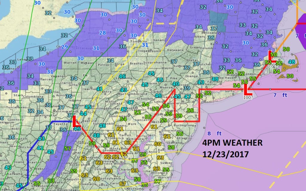 We are waiting for a wave of low pressure to move to the northeast. Weather fronts are struggling this evening with a warm front having a very difficult time moving northward while the cold front to the west is taking its sweet time moving east. Temperatures are in a wide range from the low 60s in Southern New Jersey to the low to mid 30s across the Hudson Valley and inland Connecticut.