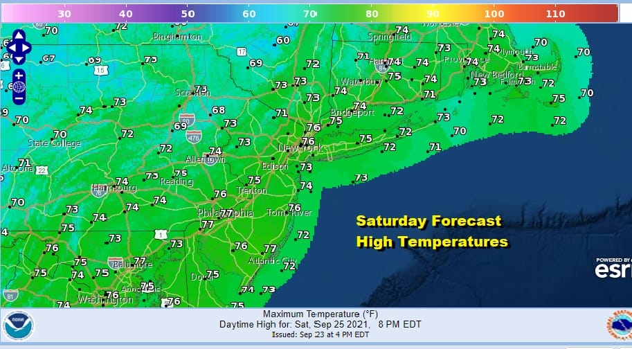 Highs will be a shade cooler Sunday with inland highs close to 70 and most everyone else between 70 and 75. Humidity levels have collapsed this afternoon and we will remain dry into next week. This is a nice first weekend of autumn.