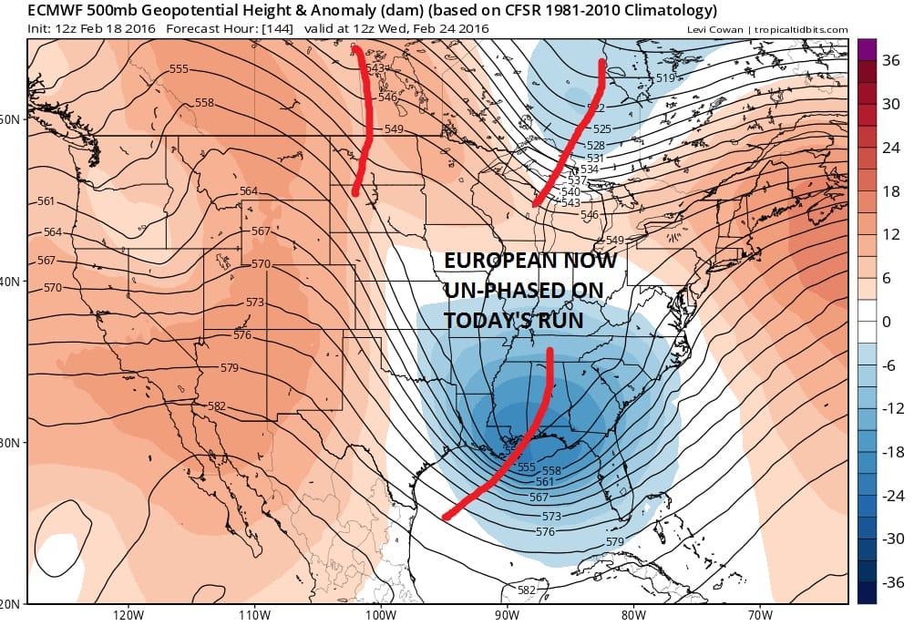 The problem is twofold. Firstly we have numerous shortwaves running around as evidenced on both models. This has been a signature of the entire winter season. Models seem to key on different shortwaves on every run. Sometimes they phase on some runs and we see deep lows. On other runs as short waves time out differently they don’t phase at all. The European on this run has moved away from the phased look and as a result has a coastal offshore track with a flatter look to it.