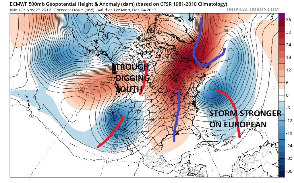 The developing low in the Canadian Maritimes is key here. As that system strengthens it weakens the ridge that attempts to build in the East. In fact models have backed off on the strength of that ridge in response to the stronger storm to the east. We also have a trough in the Rockies which is swinging east as well. The European is a bit different in how it handles the puzzle pieces with a slightly stronger ocean storm in the Maritimes. It also handles the west a bit differently as it separates the southern end of that Rockies trough and drops it southwestward.