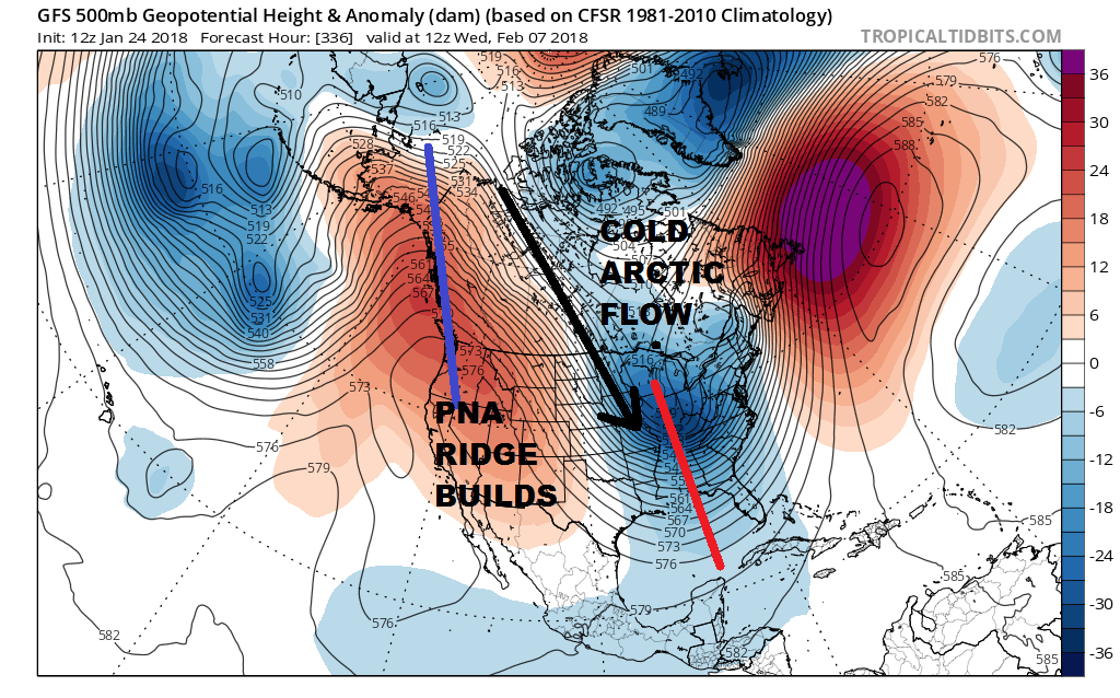 The spiking PNA index to neutral is because today’s models are showing a strong ridge beginning to build just inland of the West Coast rather then building offshore. This position is important in order to establish the connection in the flow from Northern Canada into the Eastern US.